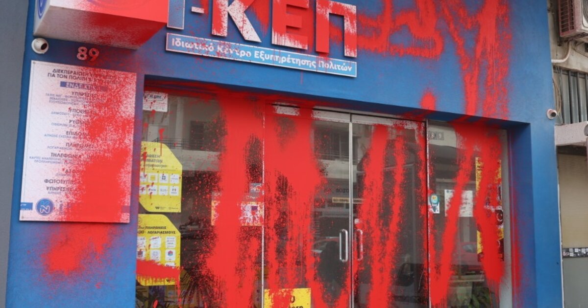 Επίθεση με κόκκινες μπογιές σε ιδιωτικό ΚΕΠ στο Ηράκλειο, εξαπέλυσαν μέλη του Ρουβίκωνα, εκφράζοντας την διαμαρτυρία τους για την υπόθεση με το κύκλωμα που εκμεταλλευόταν αλλοδαπούς.