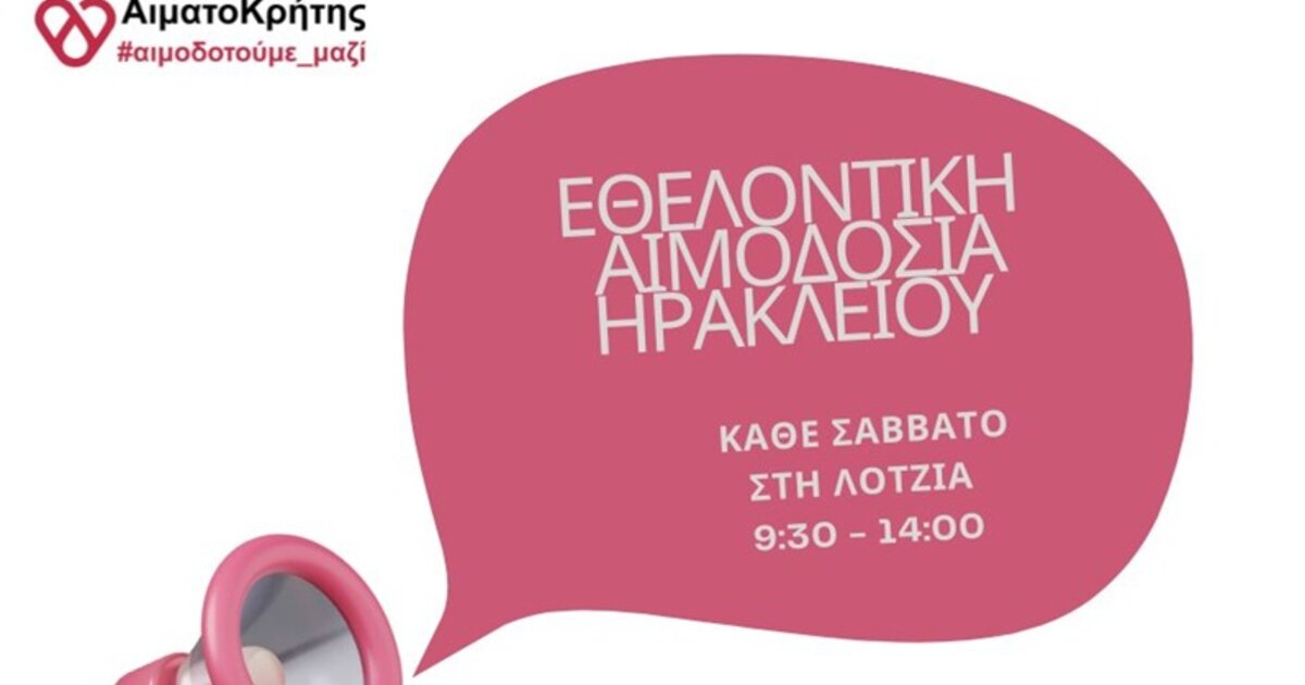 Το Σάββατο 18 Οκτωβρίου 2025 θα πραγματοποιηθεί εθελοντική αιμοδοσία στο κέντρο της πόλης του Ηρακλείου και συγκεκριμένα στο αίθριο της Λότζια από τις 09:30 έως τις 14:00. Η εθελοντική αιμοδοσία πραγματοποιείται κάθε Σάββατο.