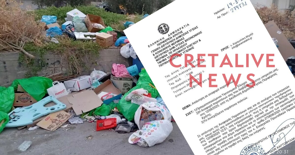 Ο κ. Καραμαλάκης με επιστολή του προς τη Διεύθυνση Δημόσιας Υγείας της Περιφέρειας Κρήτης, είχε επισημάνει την ιδιαίτερα ανησυχητική κατάσταση που επικρατεί στην πόλη και τα χωριά του Δήμου σε θέματα καθαριότητας και διαχείρισης απορριμμάτων, με άμεσες επιπτώσεις στη δημόσια υγεία.