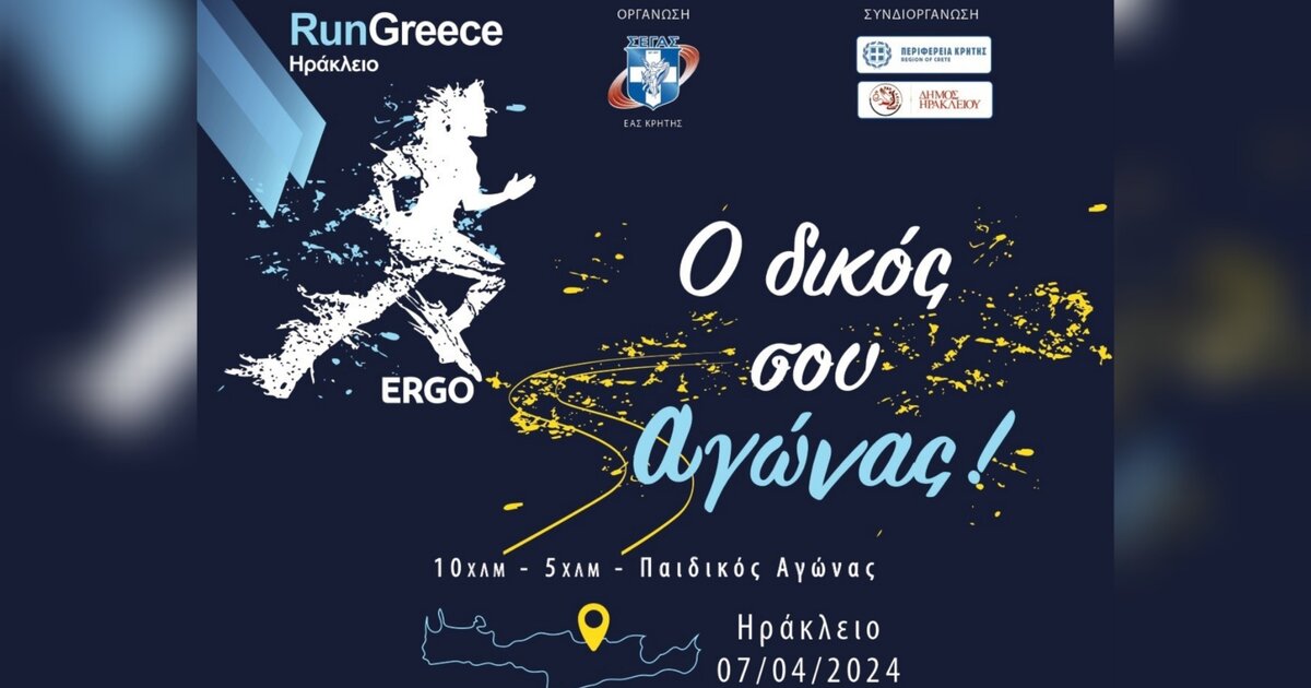 Τον αγώνα «RUN GREECE ΗΡΑΚΛΕΙΟ (5χλμ – 10χλμ και παιδικός αγώνας 1.100μ), διοργανώνουν, ο Σ.Ε.Γ.Α.Σ. και η Ε.Α.Σ. Σ.Ε.ΓΑ.Σ. Κρήτης, με συνδιοργανωτές την ΠΕΡΙΦΕΡΕΙΑ ΚΡΗΤΗΣ και τον ΔΗΜΟ ΗΡΑΚΛΕΙΟΥ, μεγάλο χορηγό την ERGO Ασφαλιστική και τοπικούς χορηγούς τις Μινωικές Γραμμές, το Σύνδεσμο Τουριστικών και Ταξιδιωτικών Γραφείων Κρήτης και τα Super Market Χαλκιαδάκης.