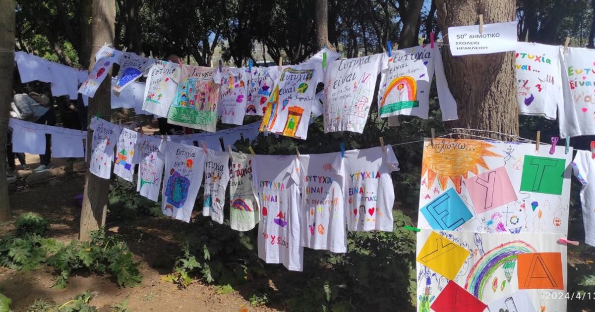 Κατά τη διάρκεια της εκδήλωσης αλληλεγγύης μικροί μαθητές από πάρα πολλά Δημοτικά και Νηπιαγωγεία του Ηρακλείου ζωγράφισαν μπλούζες τις οποίες διέθεσαν για τη στήριξη των παιδιών με νεοπλασματικές ασθένειες.