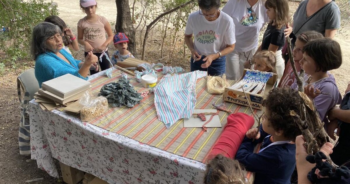 Η κ. Ελένη Κουκουλάκη μέσω της υφαντικής τέχνης καθοδήγησε μικρούς και μεγάλους στην κατασκευή «έργων τέχνης» με φυσικά υλικά από τον χώρο του πάρκου.
