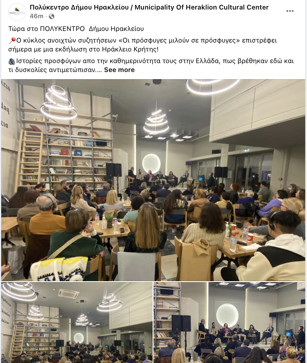 «Οι πρόσφυγες μιλούν σε πρόσφυγες» ήταν το θέμα ανοιχτής συζήτησης που πραγματοποιήθηκε στο Ηράκλειο από την Αντιπροσωπεία της Ύπατης Αρμοστείας του ΟΗΕ για τους Πρόσφυγες στην Ελλάδα, σε συνεργασία με την Αναπτυξιακή Ηρακλείου.