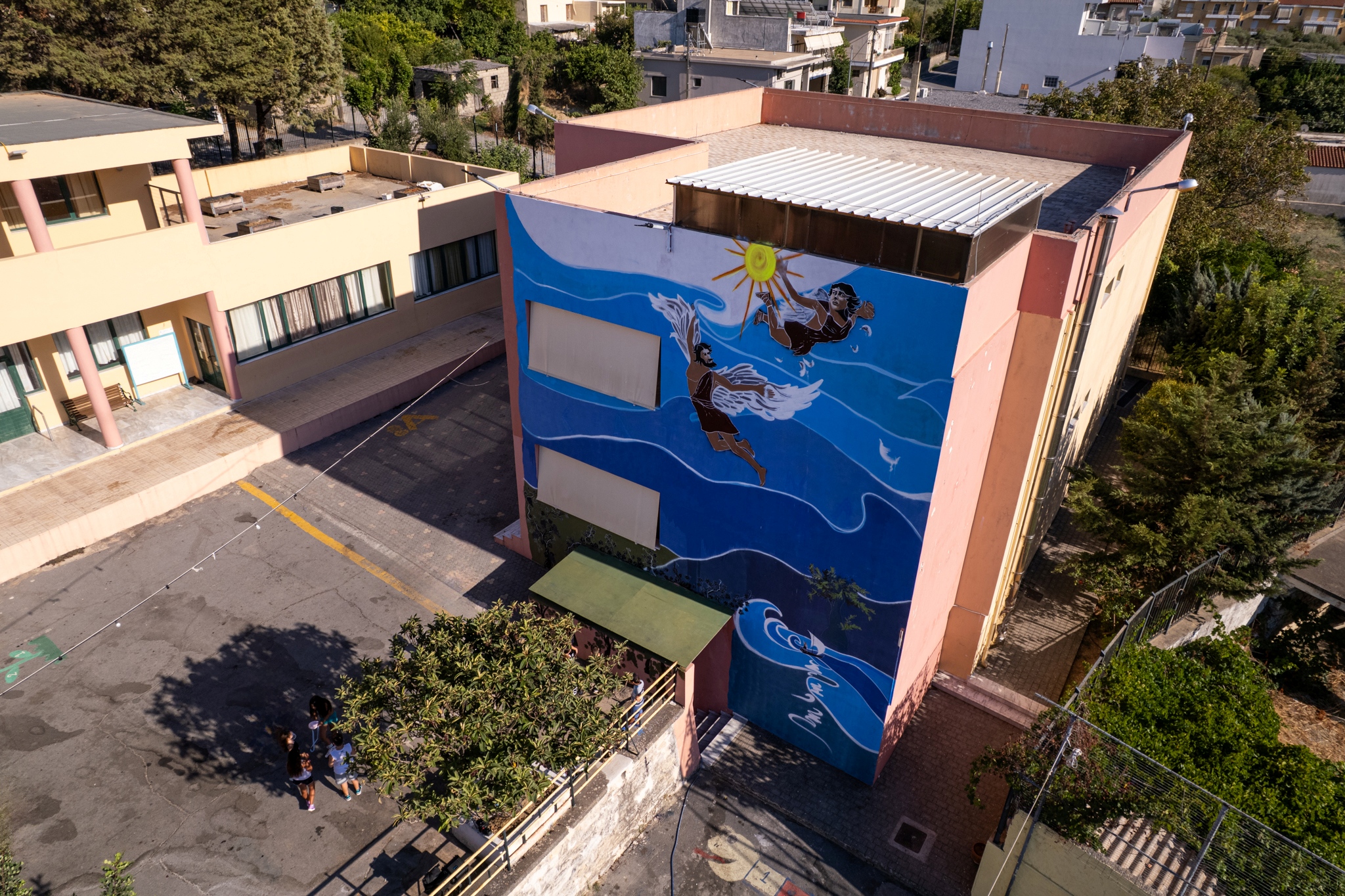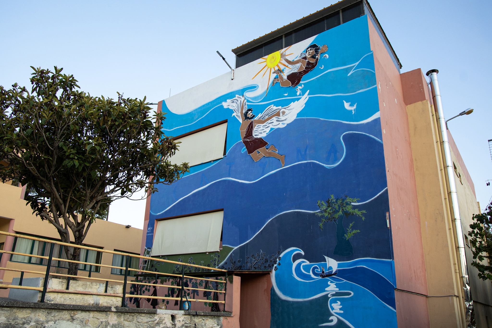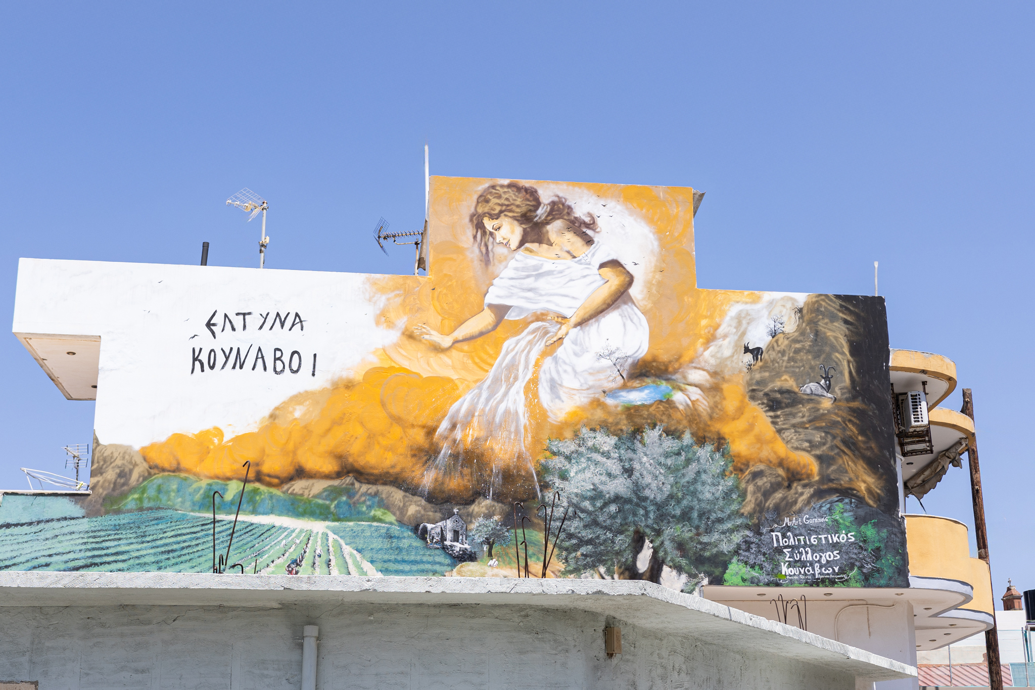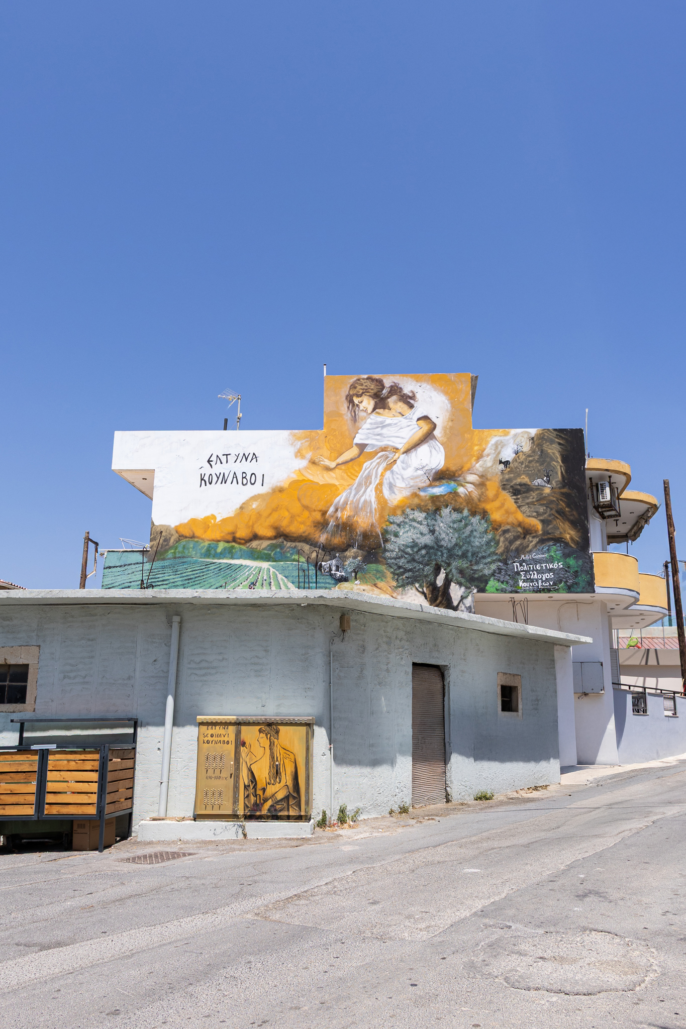 Το έργο «Δαίδαλος και Ίκαρος» μας καλεί να ανοίξουμε φτερά στη φαντασία μας. Μια τοιχογραφία που μιλάει για όνειρα, τόλμη και όρια, κοσμεί το Δημοτικό Σχολείο Κουνάβων. Δημιουργήθηκε μια τοιχογραφία που θα εμπνέει κάθε μέρα τα παιδιά να κυνηγούν τα όνειρά τους.Ο Κωστής Γριβάκης, μέσα από το εντυπωσιακό έργο του «Ερωτόκριτος, Αρετούσα και Βιτσέντζος Κορνάρος», υφαίνει μια βαθιά καλλιτεχνική αφήγηση που συνδέει την πλούσια κρητική παράδοση με τις αιώνιες αξίες της αγάπης, της πίστης και της δημιουργικότητας. Με σεβασμό και ζήλο, τιμά το κορυφαίο έργο της κρητικής λογοτεχνίας, «Ερωτόκριτο», αποτυπώνοντας τις μοναδικές μορφές και συναισθήματα των πρωταγωνιστών, ενώ ταυτόχρονα φωτίζει τη διαχρονική επιρροή αυτού του αριστουργήματος στην πολιτιστική ταυτότητα του νησιού. Το έργο του λειτουργεί σαν γέφυρα ανάμεσα στο παρελθόν και το παρόν, προσκαλώντας το κοινό να βιώσει την ομορφιά και το πάθος του κρητικού μύθου μέσα από σύγχρονη ματιά.