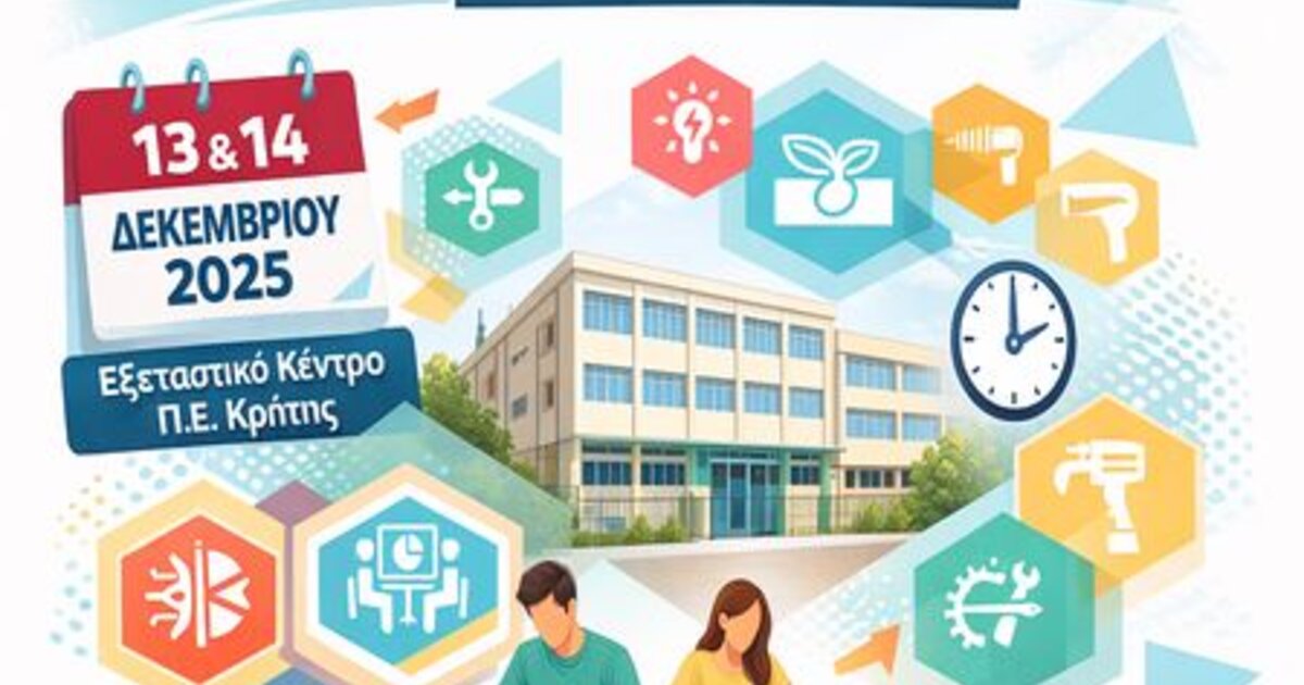 Σύμφωνα με την ανακοίνωση του ΕΟΠΠΕΠ για τις Εξετάσεις Πιστοποίησης αποφοίτων του Μεταλυκειακού Έτους – Τάξης Μαθητείας των ΕΠΑ.Λ. (1ης περιόδου 2025), ως εξεταστικό κέντρο για την Π.Ε. Κρήτης ορίστηκε το 1ο Εργαστηριακό Κέντρο Ηρακλείου, επί της οδού Ιτάνου 40, Κηπούπολη, Ηράκλειο Κρήτης, Τ.Κ. 71307 (τηλ. 281 032 3097), όπου θα διεξαχθούν οι εξετάσεις το Σάββατο 13 και την Κυριακή 14 Δεκεμβρίου 2025.