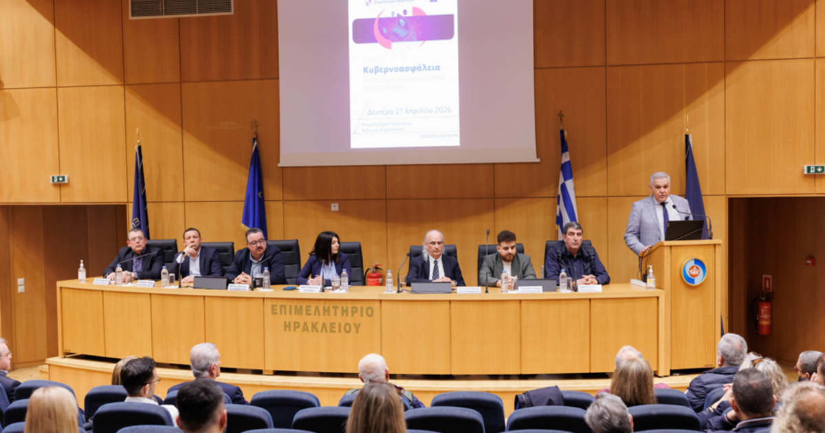 Με μεγάλη συμμετοχή και έντονο ενδιαφέρον από την επιχειρηματική κοινότητα πραγματοποιήθηκε τη Δευτέρα 27 Απριλίου 2026, στην Αίθουσα «Καστελλάκη» του Επιμελητηρίου Ηρακλείου, η ημερίδα με θέμα: «Κυβερνοασφάλεια των Μικρομεσαίων Επιχειρήσεων στην εποχή της Οδηγίας NIS2».