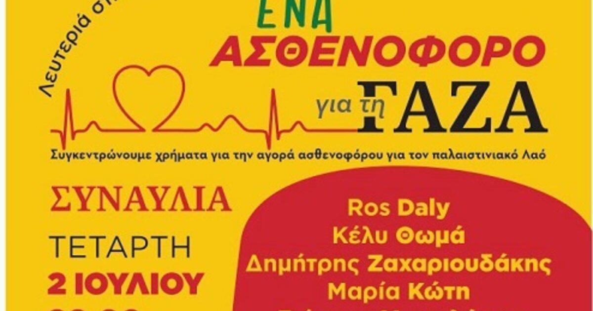 Συναυλία αλληλεγγύης στον Παλαιστινιακό Λαό θα πραγματοποιηθεί την Τετάρτη 2 Ιουλίου, στις 20:00 στο Πάρκο Γεωργιάδη στο Ηράκλειο, με σκοπό τη συγκέντρωση χρημάτων για την αγορά ενός ασθενοφόρου στη Γάζα.