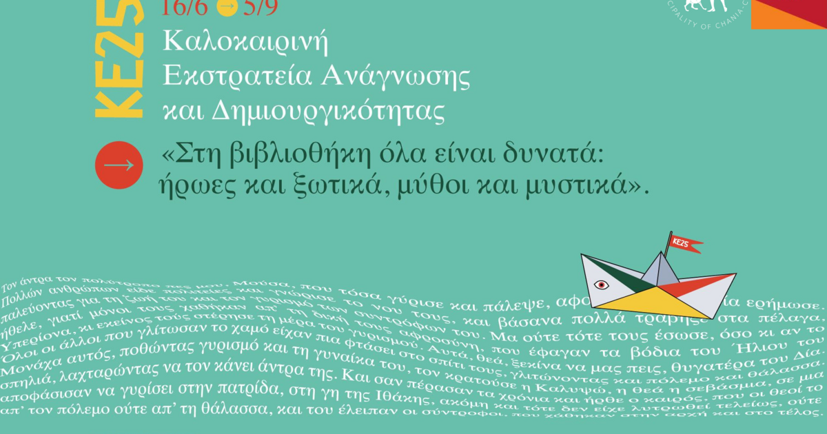 Η Καλοκαιρινή Εκστρατεία Ανάγνωσης και Δημιουργικότητας 2025 είναι για ακόμα μια χρονιά εδώ! Από τη Δευτέρα 16 Ιουνίου έως και την Παρασκευή 5 Σεπτεμβρίου 2025, η Δημοτική Βιβλιοθήκη Χανίων συμμετέχει δυναμικά στην πανελλαδική δράση του Δικτύου Ελληνικών Βιβλιοθηκών, προσκαλώντας παιδιά και εφήβους σε ένα συναρπαστικό καλοκαιρινό ταξίδι φαντασίας, γνώσης και δημιουργικότητας.