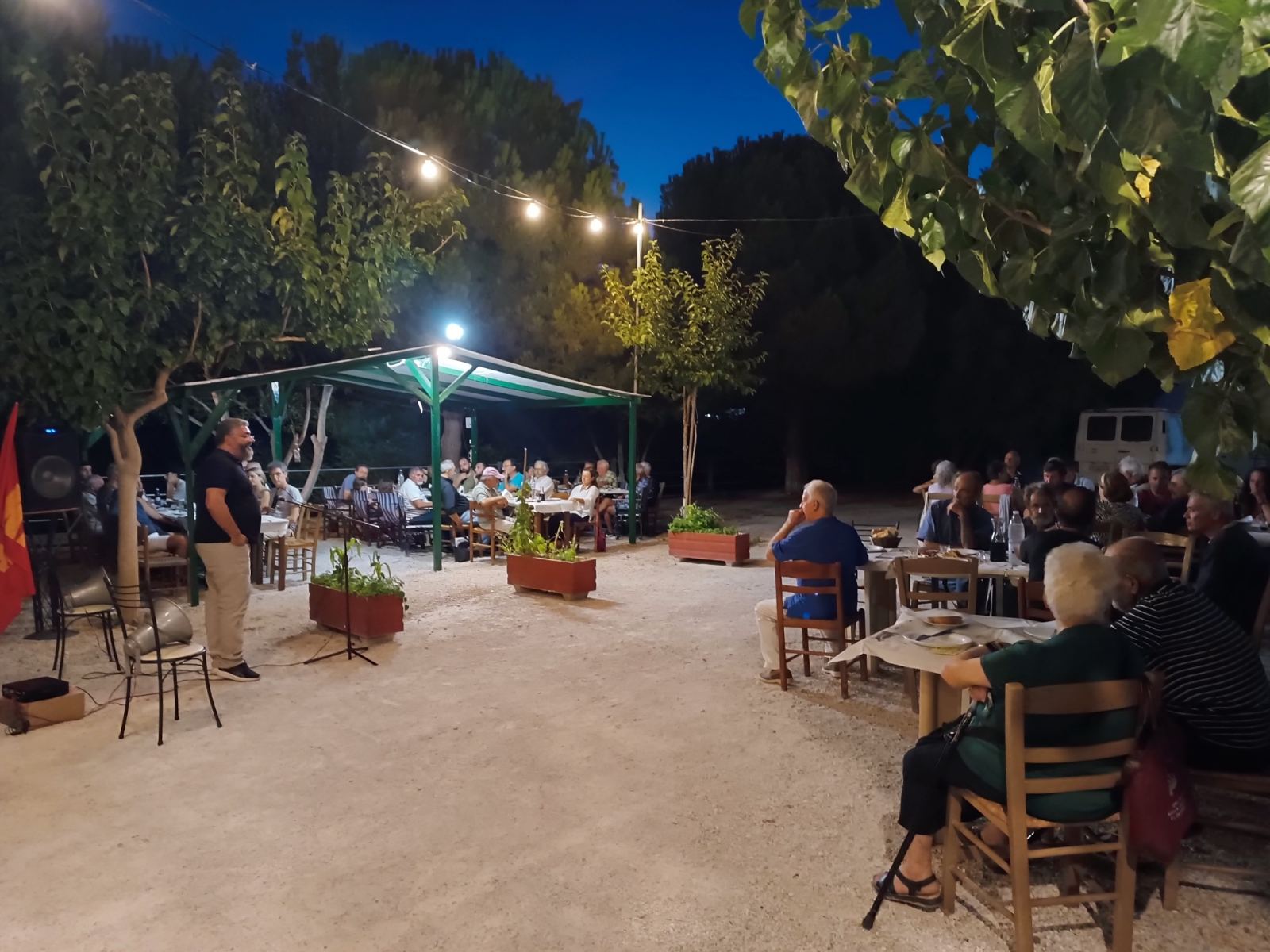 Η εκδήλωση ολοκληρώθηκε με συνεστίαση, στο καφενείο του Γιώργου Κοντάκη, στην πλατεία του Βουτά, όπου μίλησε ο Φώτης Ρηγανάκος, μέλος του Τομεακού Γραφείου Χανίων του ΚΚΕ. Ο Φώτης Ρηγανάκος στη ομιλία του επισήμανε την ανάγκη μελέτης της ιστορίας η οποία φωτίζει τον δρόμο αγωνιστικής διεκδίκησης. Έχοντας, είπε ως φωτεινό φάρο την ηρωική εποποιία του ΔΣΕ μπορούμε, ακολουθώντας την ίδια πορεία, να σηκώσουμε ανάστημα ενάντια στις πολιτικές οι οποίες μας καταδικάζουν σε μία ζωή χωρίς δικαιώματα.