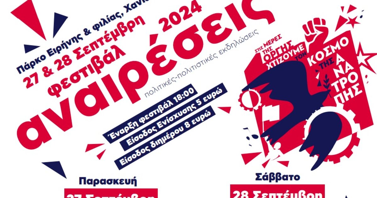21:00: ΣΥΝΑΥΛΙΑΤο Φεστιβάλ Αναιρέσεις επιστρέφει στον χώρο του Πάρκου Ειρήνης και Φιλίας των λαών στις 27 και 28 Σεπτεμβρίου, με κεντρικό σύνθημα «Στις μέρες οργής χτίζουμε τον κόσμο της ανατροπής!» και μας καλεί με ενδιαφέρουσες πολιτικές και πολιτιστικές εκδηλώσεις.