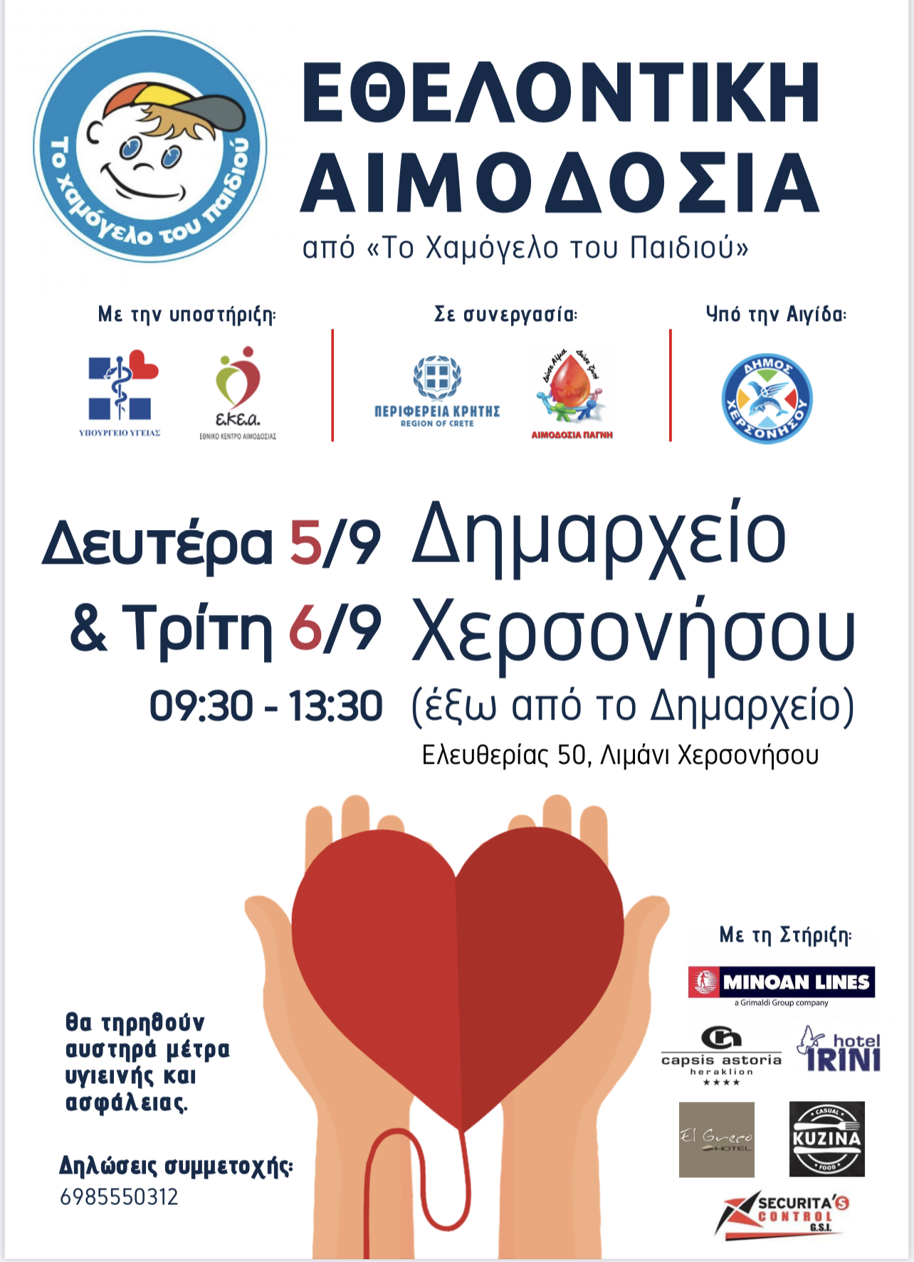 •5 & 6 Σεπτεμβρίου - Αιμοδοσία - Δημαρχείο Χερσονήσου, Ελευθερίας 50 Λιμάνι Χερσονήσου - ώρες 09:30-13:30