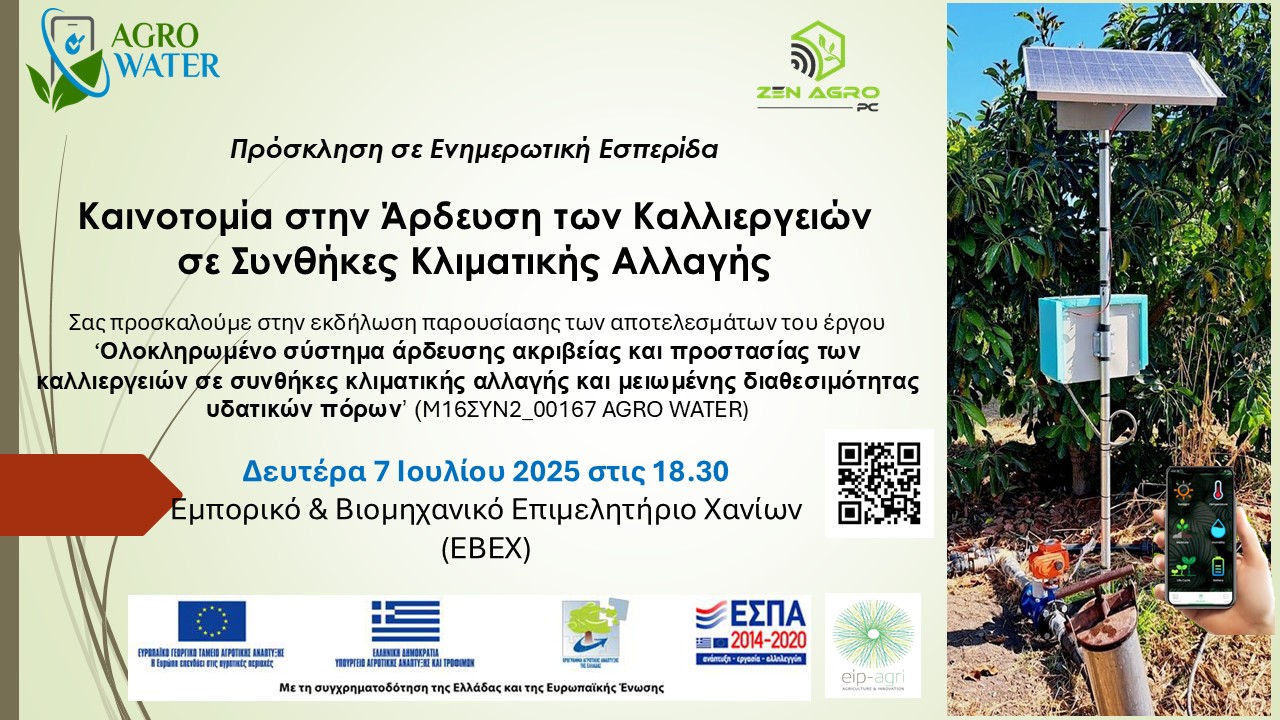 Η ZEN AGRO-Γεωργία Ακριβείας και οι εταίροι του έργου AGROWATER οργανώνουν ενημερωτική εσπερίδα-συζήτηση με θέμα ‘Καινοτομία στην Άρδευση των Καλλιεργειών σε Συνθήκες Κλιματικής Αλλαγής’ τη Δευτέρα 7 Ιουλίου 2025 στις 18.30 στην αίθουσα του Εμπορικού και Βιομηχανικού Επιμελητηρίου Χανίων (ΕΒΕΧ).