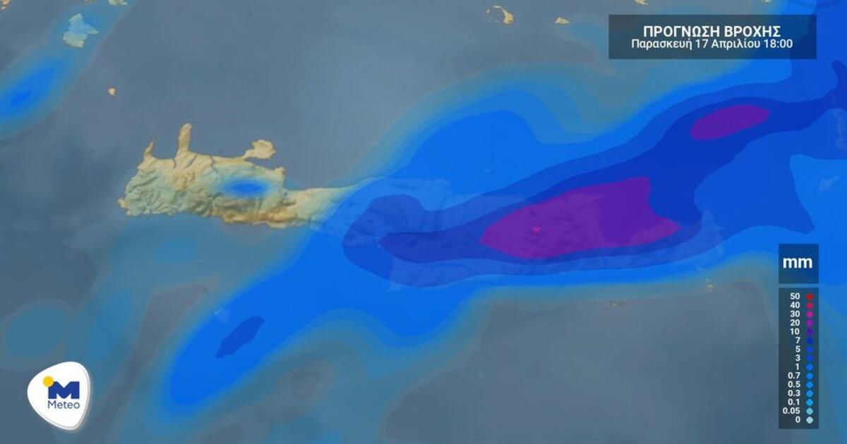 Νεφώσεις με τοπικές βροχές και σποραδικές καταιγίδες, πιθανώς κατά τόπους ισχυρές στην Κρήτη (κυρίως την ανατολική) αναμένονται την Παρασκευή 17/4, από τις προμεσημβρινές ώρες μέχρι το απόγευμα.