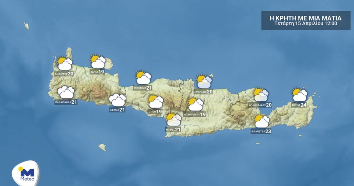 Με αυξημένες νεφώσεις που σταδιακά θα ελαττωθούν θα ξημερώσει η Τετάρτη 15 Απριλίου στην Κρήτη. Οι νοτιάδες θα είναι το κύριο χαρακτηριστικό του καιρού, ενώ η θερμοκρασία σε διάφορες περιοχές θα ξεπεράσει τους 20 βαθμούς Κελσίου.