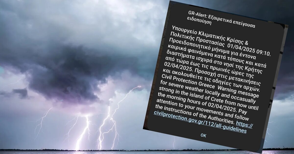 «Προειδοποιητικό μήνυμα για έντονα καιρικά φαινόμενα κατά τόπους και κατά διαστήματα ισχυρά στο νησί της Κρήτης, από τώρα έως τις πρωινές ώρες της 02-04-2025». Στο ίδιο μήνυμα επισημαίνεται ότι απαιτείται προσοχή στις μετακινήσεις και να ακολουθούνται οι οδηγίες των αρχών.