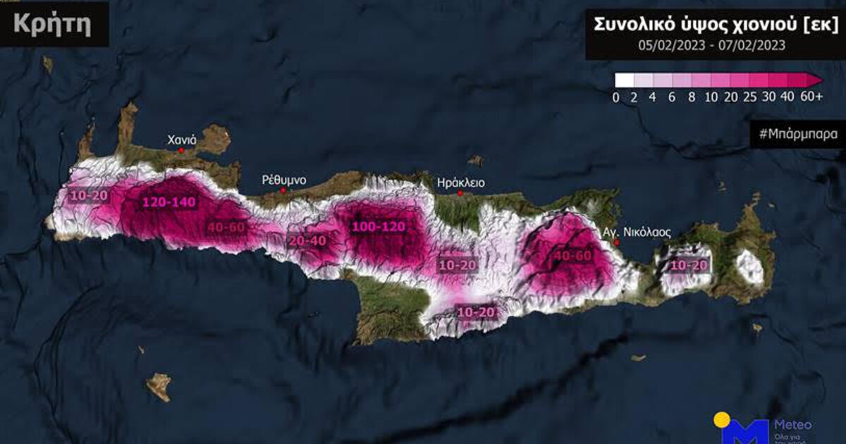 Σύμφωνα με τα νεότερα προγνωστικά στοιχεία του Εθνικού Αστεροσκοπείου Αθηνών / meteo.gr, ο σχετικός χάρτης παρουσιάζει το εκτιμώμενο αθροιστικό ύψος χιονιού στην Κρήτη μέχρι το βράδυ της Τρίτης 07/02, με εκτίμηση για ύψος χιονιού άνω του ενός μέτρου στα ορεινά του νησιού.