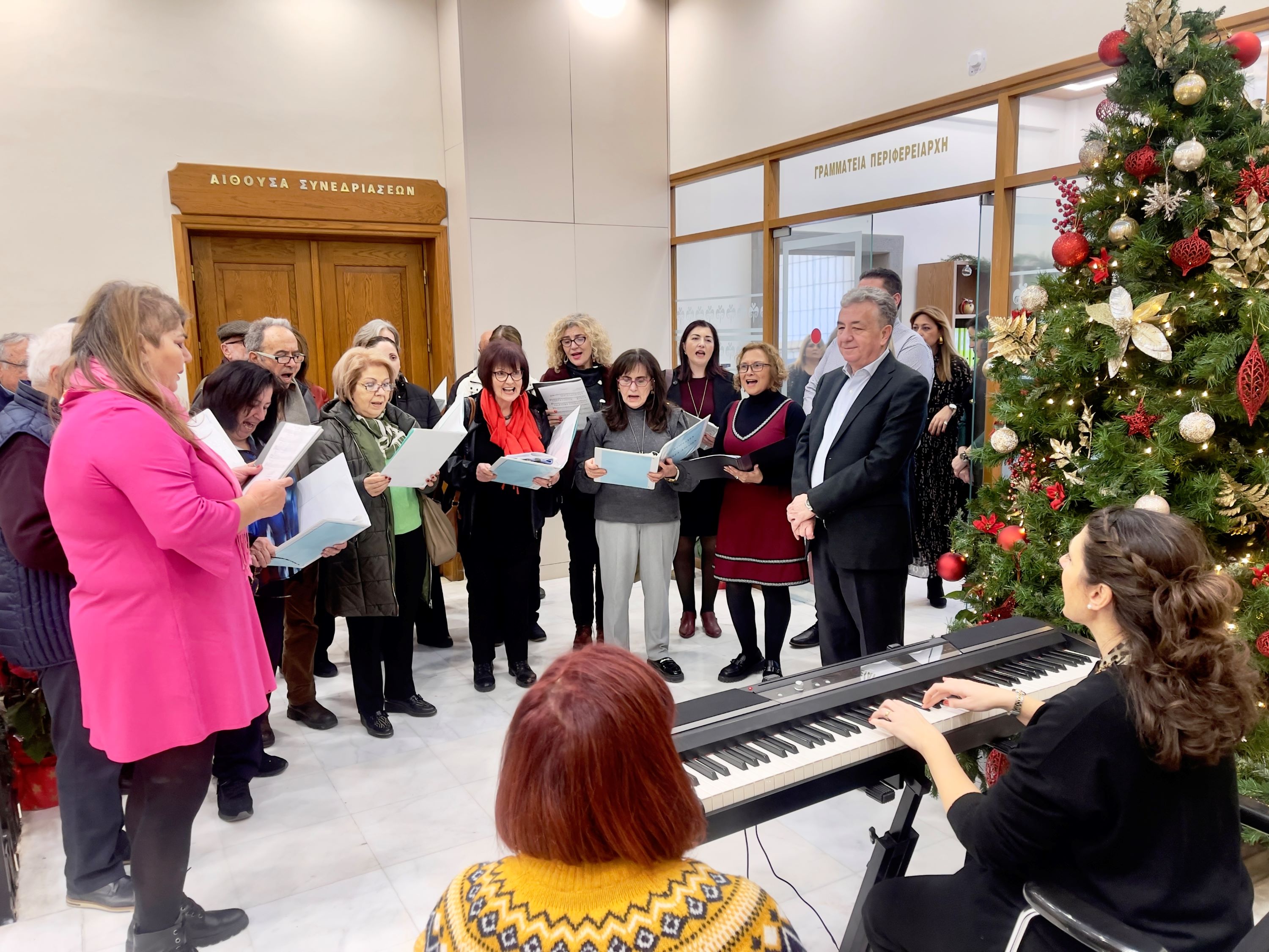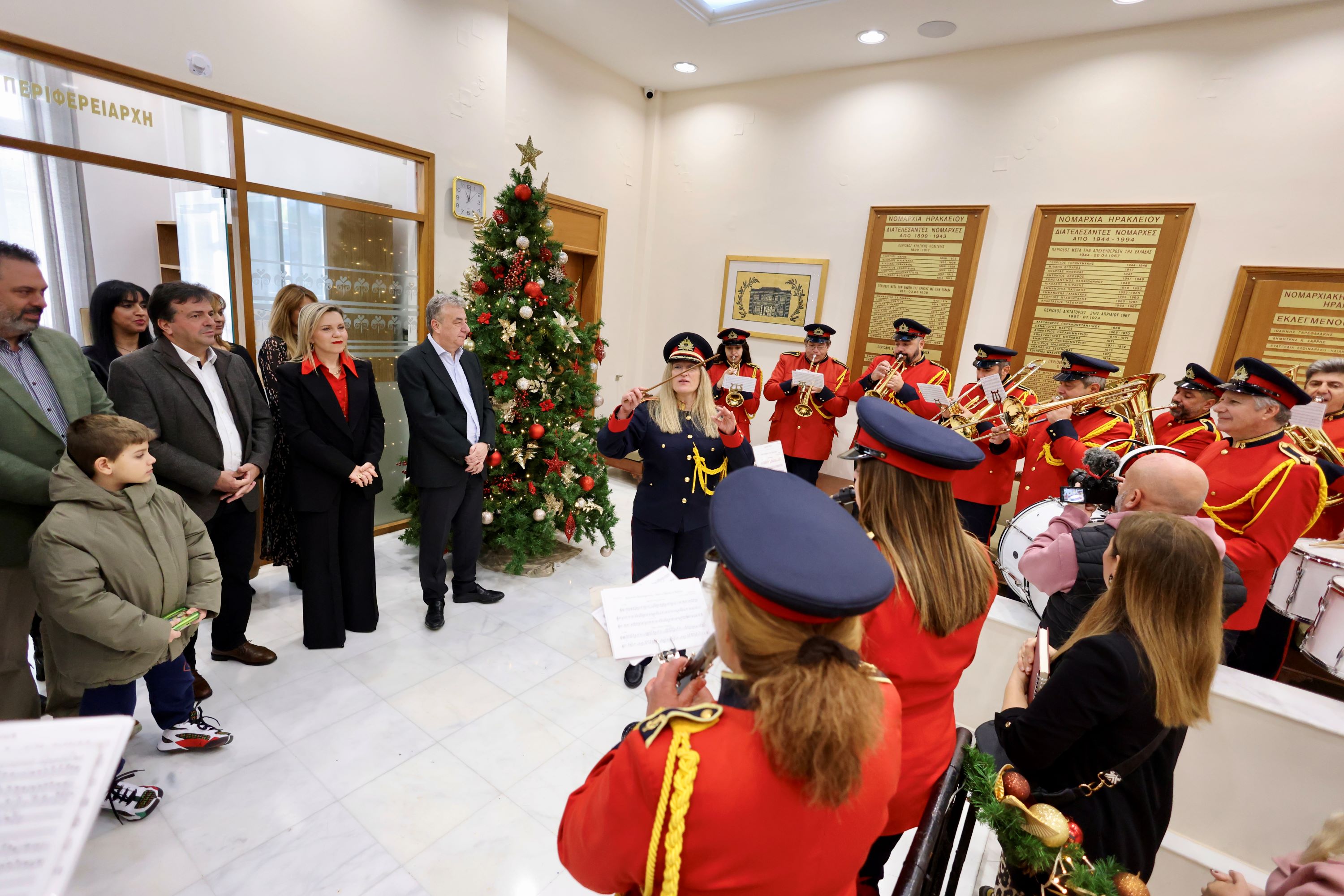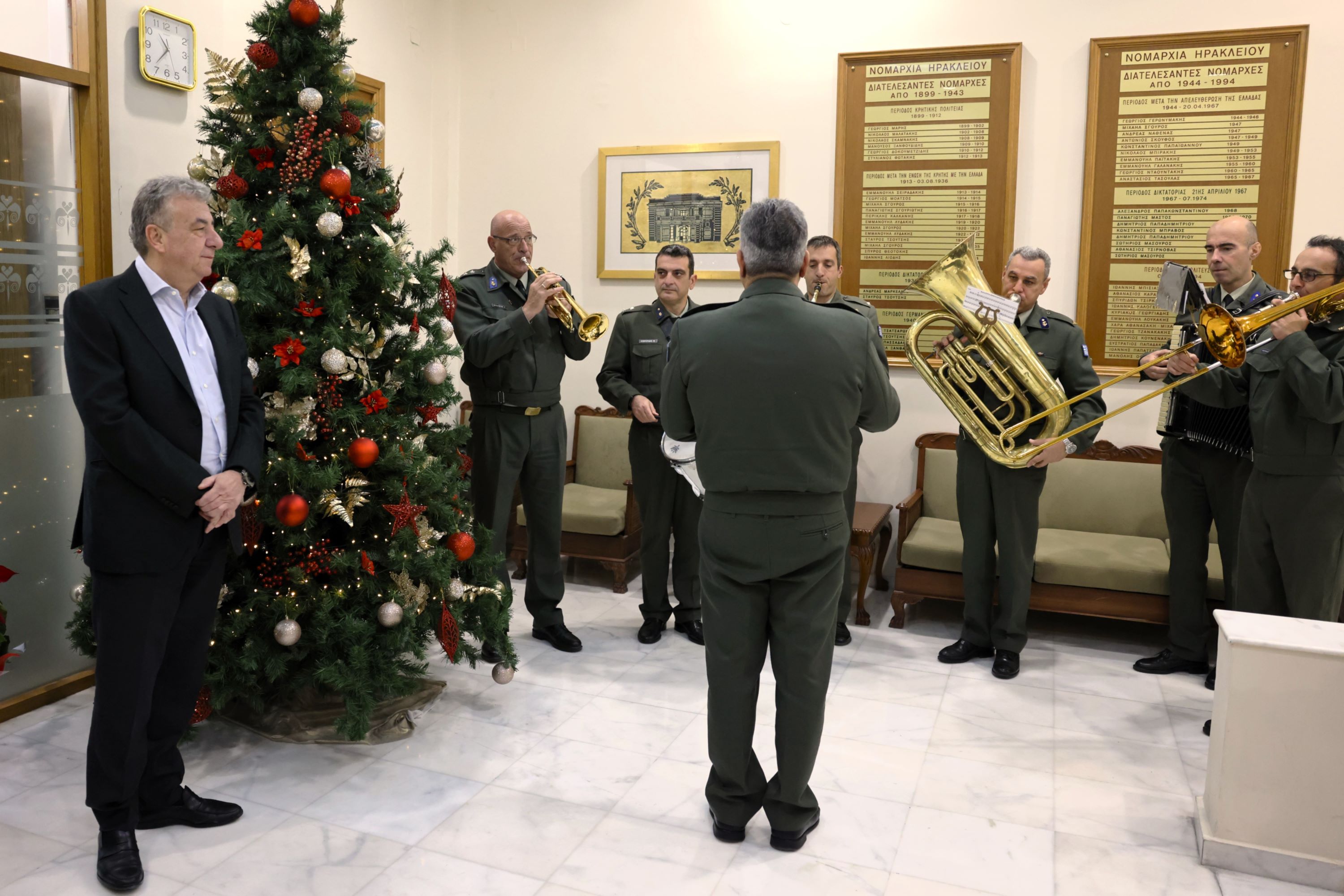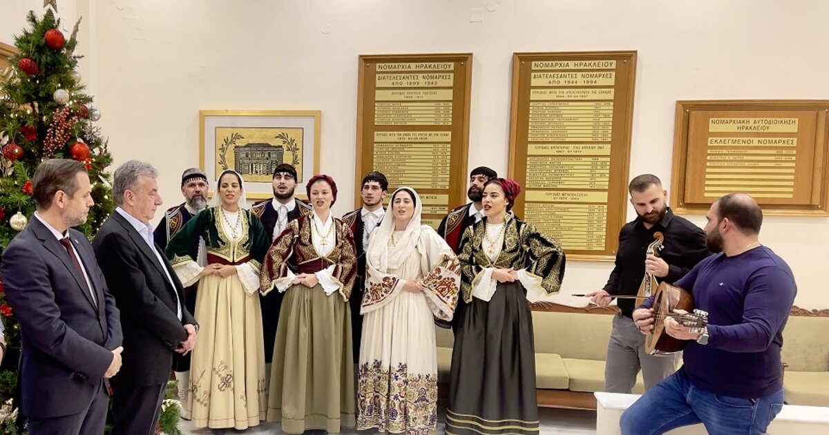 Ο όμιλος Βρακοφόρων Κρήτης με το Γιώργο Γλυκοκόκαλο στη λύρα και τον Γιάννη Χαραλαμπάκη στο λαούτο, τραγούδησαν τα κρητικά κάλαντα και χόρεψαν παραδοσιακούς χορούς. Ο Πρόεδρος του Ομίλου Γιάννης Πετράκης συνόδευσε τις ευχές με το μετάλλιο του Ομίλου και μια μαντινάδα προς τον Περιφερειάρχη Κρήτης: