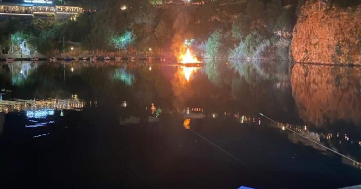 Η σχεδία, με τη βοήθεια κάποιου βαρκάρη μεταφέρεται στο κέντρο της λίμνης και η φωτιά φτάνει από την κορυφή του υψώματος, με τη βοήθεια σχοινιών που επιπλέον κρατούν σταθερή την κατασκευή.