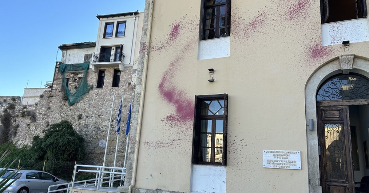 Συνθήματα και μπογιές στο κτήριο της Αποκεντρωμένης Διοίκησης στο Ηράκλειο