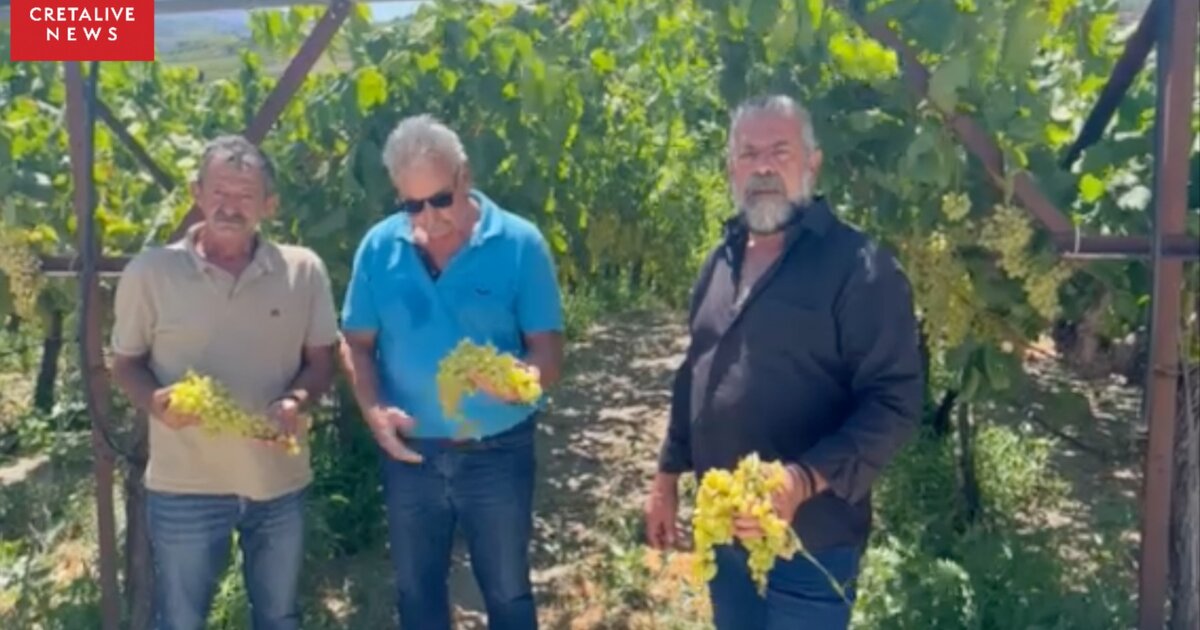 Ο πρόεδρος της Ομάδας Αμπελουργών Κρήτης Πρίαμος Ιερωνυμάκης και οι αγρότες της περιοχής Γιώργος Μεταξάκης και Παντελής Χατζηδάκης δείχνουν την καταστροφή που υπέστησαν οι αμπελώνες και ζητούν μέτρα για τη στήριξη των παραγωγών!