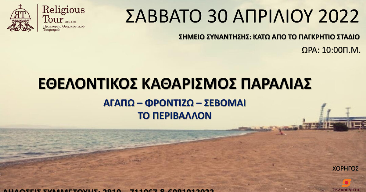 Στο πλαίσιο του κοινωνικού της ρόλου λοιπόν, και αντιλαμβανόμενη τις κοινωνικές και περιβαλλοντικές ανάγκες, η ΚΟΙΝ.Σ.ΕΠ. Religious Tour διοργανώνει καθαρισμό της παραλίας πίσω από το Παγκρήτιο Στάδιο το Σάββατο 30 Απριλίου και ώρα 10:00π.μ και προσκαλεί όλους τους ενδιαφερόμενους συμπολίτες να συμμετέχουν.