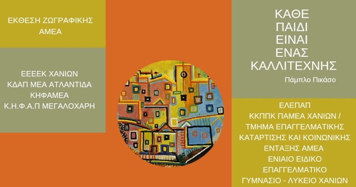 Ο Δήμος Χανίων, με μέριμνα από το Τμήμα Κοινωνικής Πολιτικής, Προστασίας ΑμεΑ & Ισότητας και σε συνεργασία με το Δημοτικό Λιμενικό Ταμείο Χανίων, παρουσιάζουν την έκθεση με θέμα: «Κάθε παιδί είναι ένας καλλιτέχνης» (Πάμπλο Πικάσο), από έργα μαθητών ΑμεΑ, στο Γιαλί Τζαμί, στο Ενετικό λιμάνι Χανίων.