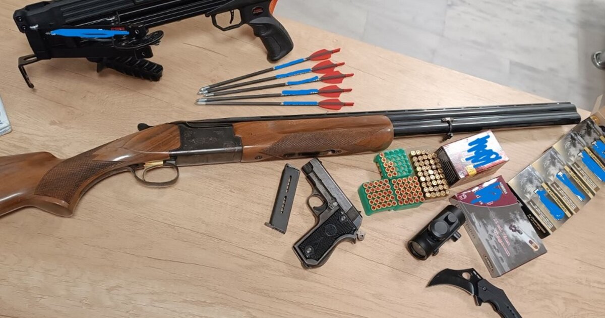 Συγκεκριμένα, βρέθηκαν ένα κυνηγετικό όπλο, σφαίρες κι ένα μαχαίρι, μεταξύ άλλων.