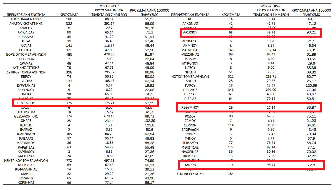 Σύμφωνα με τα στοιχεία της ημερήσιας έκθεσης επιδημιολογικής επιτήρησης τα κρούσματα στην Κρήτη κατανέμονται ως εξής: