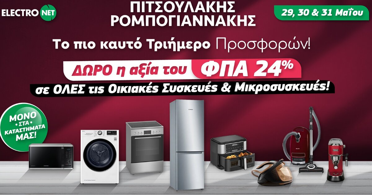 Για τρεις μόνο ημέρες, από σήμερα 29 έως και το Σάββατο 31 Μαΐου, τα καταστήματα Πιτσουλάκης Ρομπογιαννάκης κάνουν δώρο την αξία του ΦΠΑ 24% σε όλες τις Οικιακές Συσκευές και Μικροσυσκευές! Ναι, καλά διαβάσατε! Μία πραγματική ευκαιρία να ανανεώσει κανείς το σπίτι του με ό,τι χρειάζεται, από ψυγεία και πλυντήρια, μέχρι μικροσυσκευές κουζίνας και καθαριότητας, σε μοναδικές τιμές.