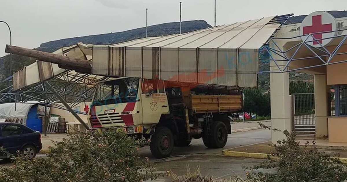 Το γερανοφόρο φορτηγό του ΔΕΔΔΗΕ δεν χωρούσε να περάσει και έριξε την οροφή της κεντρικής πύλης. Η κίνηση των οχημάτων μέχρι την αποκατάσταση του προβλήματος έπρεπε να γίνεται από τη νότια πύλη στην πίσω πλευρά του νοσοκομείου.