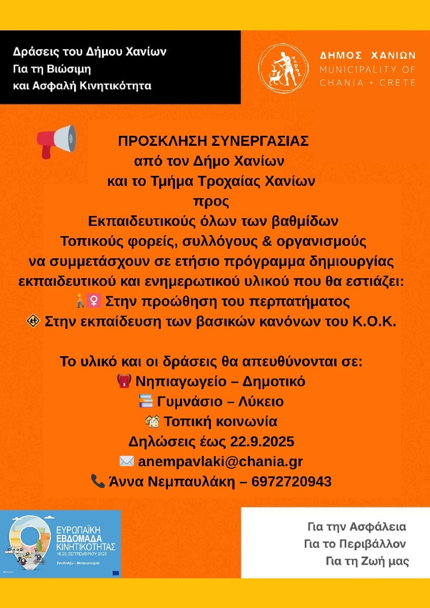 Οι δηλώσεις συμμετοχής θα γίνονται δεκτές έως τις 23/9/2025 στο email: anempavlaki@chania.gr και στο τηλ. 6972720943