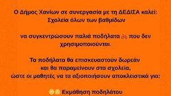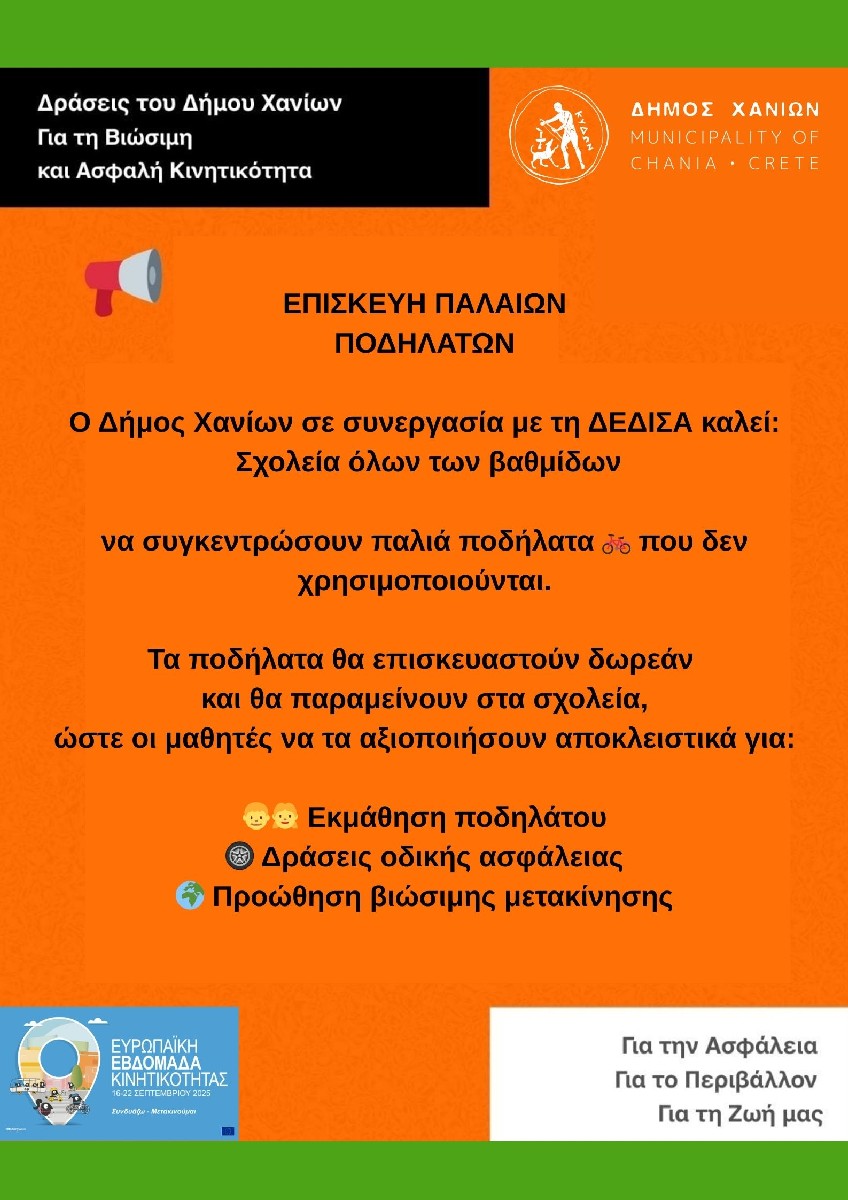Στο πλαίσιο των δράσεων, τα σχολεία που θα συγκεντρώσουν παλιά ποδήλατα για χρήση στις σχολικές τους μονάδες, θα έχουν τη δυνατότητα να τα επισκευάσουν δωρεάν μέσω του Δήμου Χανίων και της ΔΕΔΙΣΑ, με δηλώσεις συμμετοχής έως τις 23/9/2025.