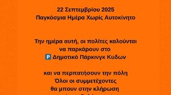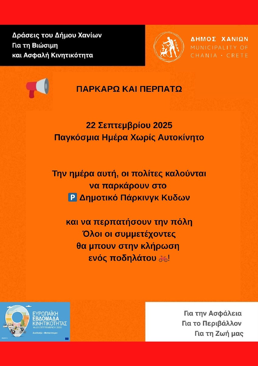 Την Τρίτη 23 Σεπτεμβρίου, στο πλαίσιο της δράσης «Παρκάρω και Περπατώ», όλοι οι πολίτες που θα σταθμεύσουν στο Δημοτικό Πάρκινγκ ΚΥΔΩΝ θα λάβουν μέρος σε κλήρωση για ένα ποδήλατο, στέλνοντας το μήνυμα «Αφήνω το αυτοκίνητο και περπατώ».