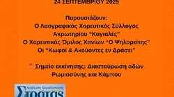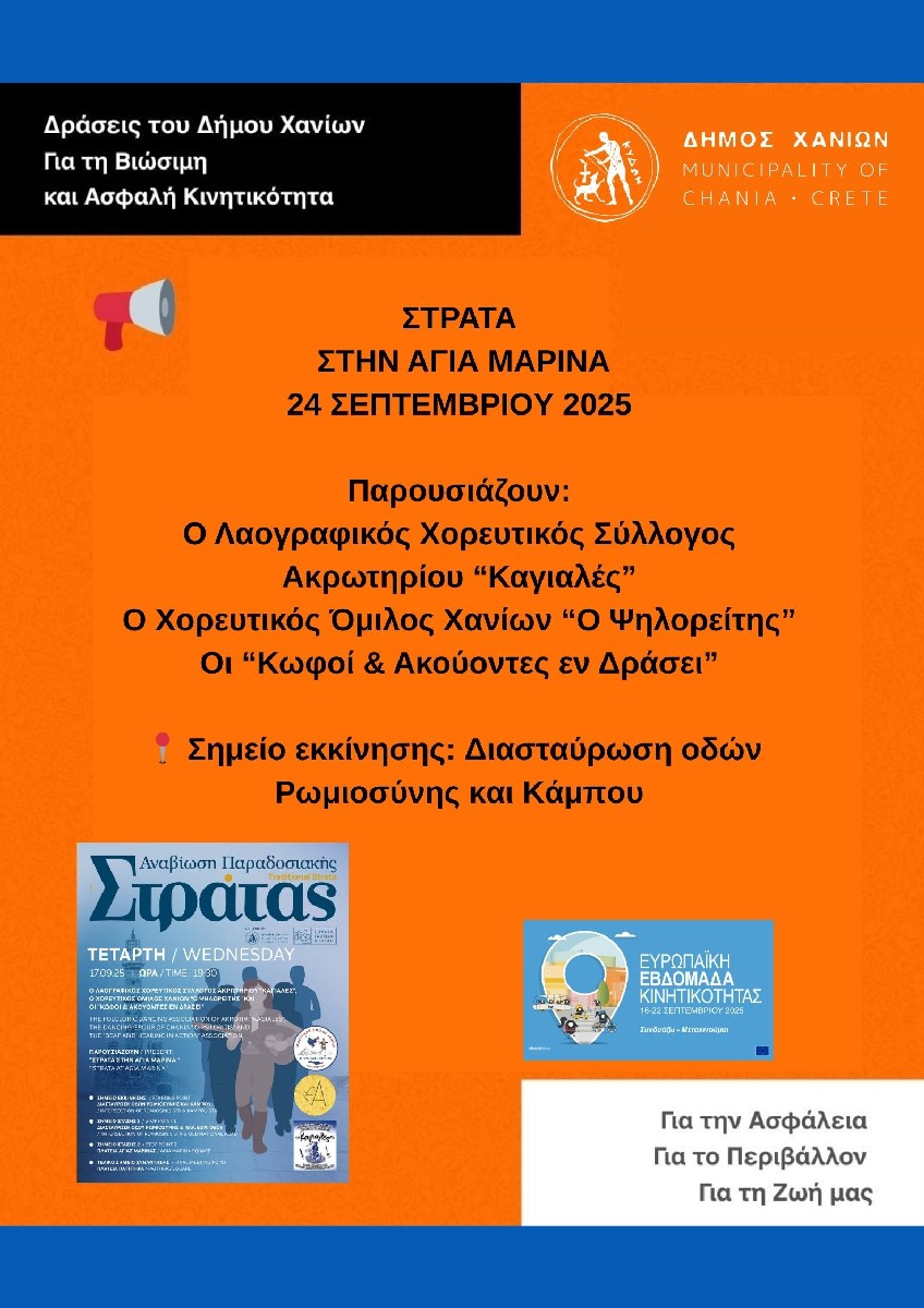Την Τετάρτη 24 Σεπτεμβρίου, το Τμήμα Τουρισμού του Δήμου Χανίων, σε συνεργασία με τον Λαογραφικό Χορευτικό Σύλλογο Ακρωτηρίου «Καγιαλές», τον Χορευτικό Όμιλο Χανίων «Ο Ψηλορείτης» και την ομάδα «Κωφοί και Ακούοντες εν Δράσει», διοργανώνει την Παραδοσιακή Στράτα του Δήμου Χανίων, στην Αγιά Μαρίνα.