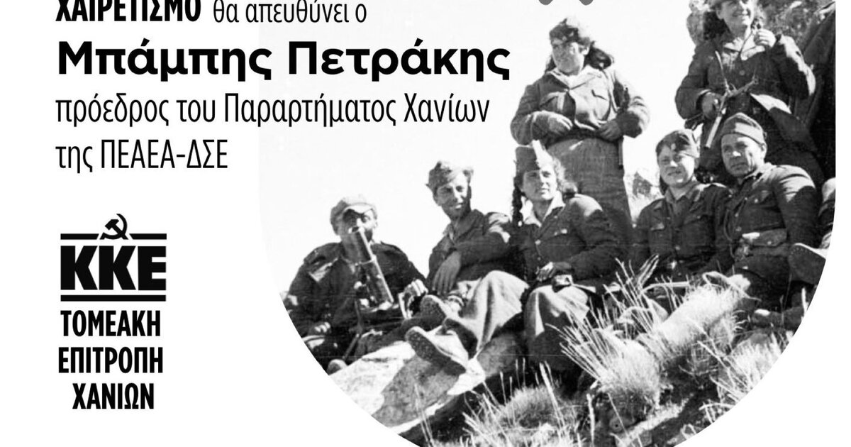 Η Τομεακή Επιτροπή Χανίων του ΚΚΕ τιμά τους μαχητές και τις μαχήτριες του Δημοκρατικού Στρατού Ελλάδας. Την Παρασκευή 29 Αυγούστου στις 18:30 στην Χρυσοσκαλίτισσα Κισσάμου διοργανώνει εκδήλωση για τα αποκαλυπτήρια μνημείου αφιερωμένου στα παλικάρια της επαρχίας Κισσάμου που έδωσαν τη ζωή τους αγωνιζόμενοι για το δίκιο του λαού την περίοδο της τρίχρονης εποποιΐας του Δημοκρατικού Στρατού Ελλάδας.