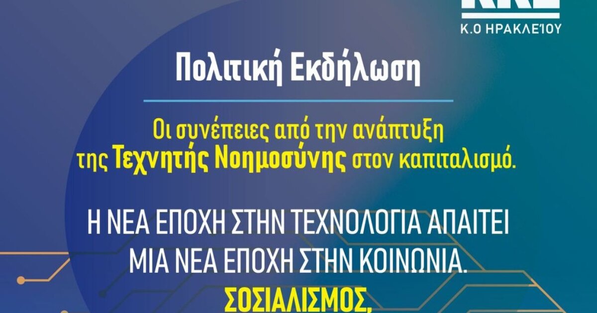 Η Τομεακή Επιτροπή Ηρακλείου του ΚΚΕ διοργανώνει Πολιτική Εκδήλωση το Σάββατο 11 Οκτωβρίου, ώρα 7:00μμ, στο Αμφιθέατρο Γ’ του ΕΛΜΕΠΑ με θέμα : «Οι συνέπειες από την ανάπτυξη της Τεχνητής Νοημοσύνης στον