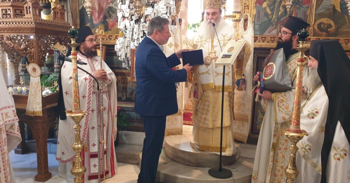 Τα μέλη του ΔΣ του Παγκοσμίου Συμβουλίου Κρητών είχαν την ευκαιρία να συμμετέχουν στη θεία Λειτουργία στην οποία χοροστάτησε ο Σεβασμιώτατος Μητροπολίτης Κισάμου και Σελίνου κ.κ. Αμφιλόχιος, ο οποίος μετά την Θεία Λειτουργία καλωσόρισε το Παγκόσμιο Συμβούλιο Κρητών, αναφέρθηκε στους δεσμούς που έχει η Ορθόδοξη Ακαδημία Κρήτης με τους Ομογενείς και έδωσε στον πρόεδρο του Συμβουλίου, Νίκο Καστρινάκη, αναμνηστικό δώρο από τα 50 Χρόνια της λειτουργίας της. Με την σειρά του ο κ. Καστρινάκης έδωσε τιμητική διάκριση στον κ.κ. Αμφιλόχιο και εξήγησε τους λόγους που επιλέχθηκε η Ορθόδοξη Ακαδημία Κρήτης για να φιλοξενήσει το Μεγάλο Συνέδριο του Παγκοσμίου Συμβουλίου Κρητών.
