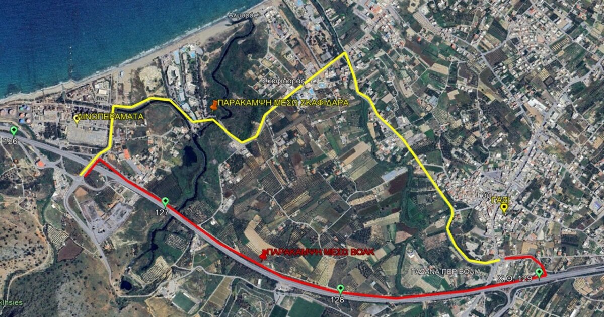 Η κίνηση των οχημάτων από και προς Λινοπεράματα, θα διεξάγεται από δυο εναλλακτικές διαδρομές, διαμέσου του Κόμβου Γαζίου, και συγκεκριμένα: