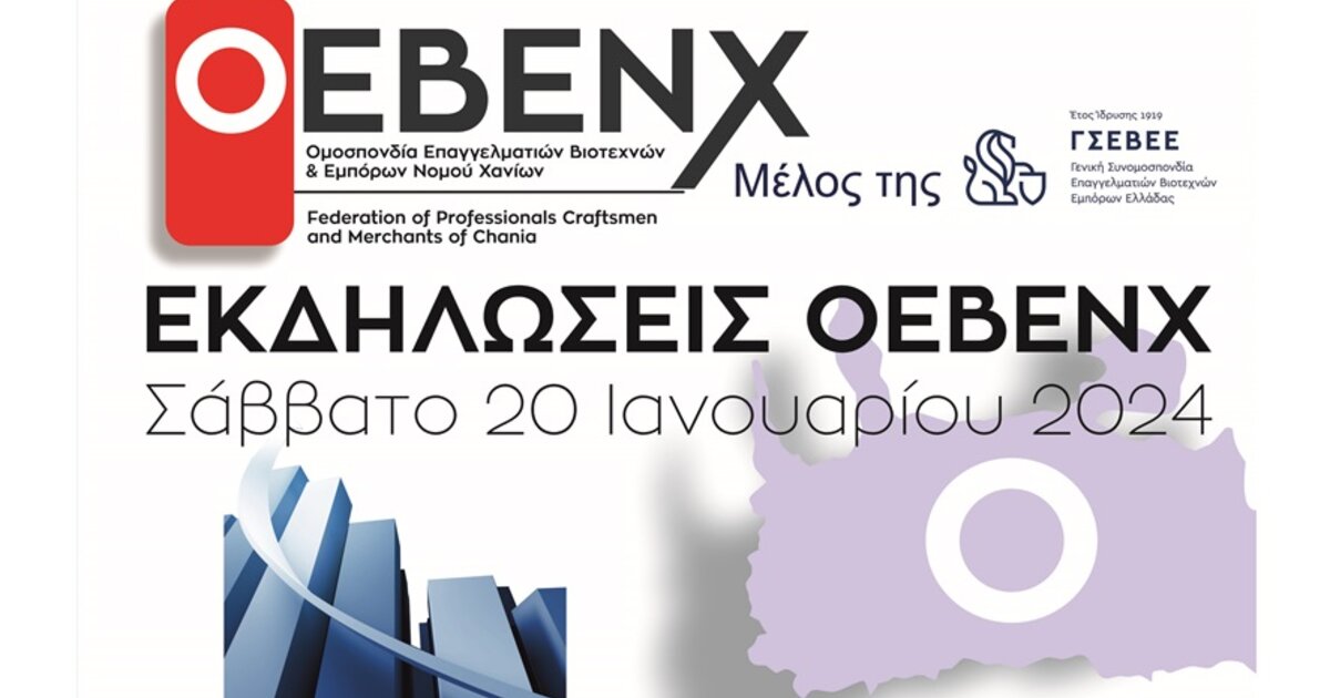 Η Ομοσπονδία Επαγγελματιών Βιοτεχνών και Εμπόρων Ν. Χανίων διοργανώνει το Σάββατο 20 Ιανουαρίου 2024:
