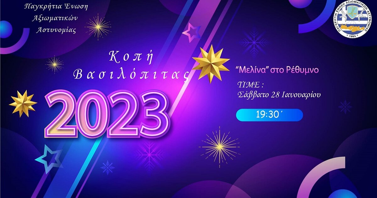 Στο Ρέθυμνο απόψε, στις 19:30, στο κέντρο «Μελίνα» θα κόψει την βασιλόπιτα η Ένωση Αξιωματικών ΕΛ.ΑΣ Περιφέρειας Κρήτης, με την ευχή για ένα υγιές και ασφαλές νέο έτος.