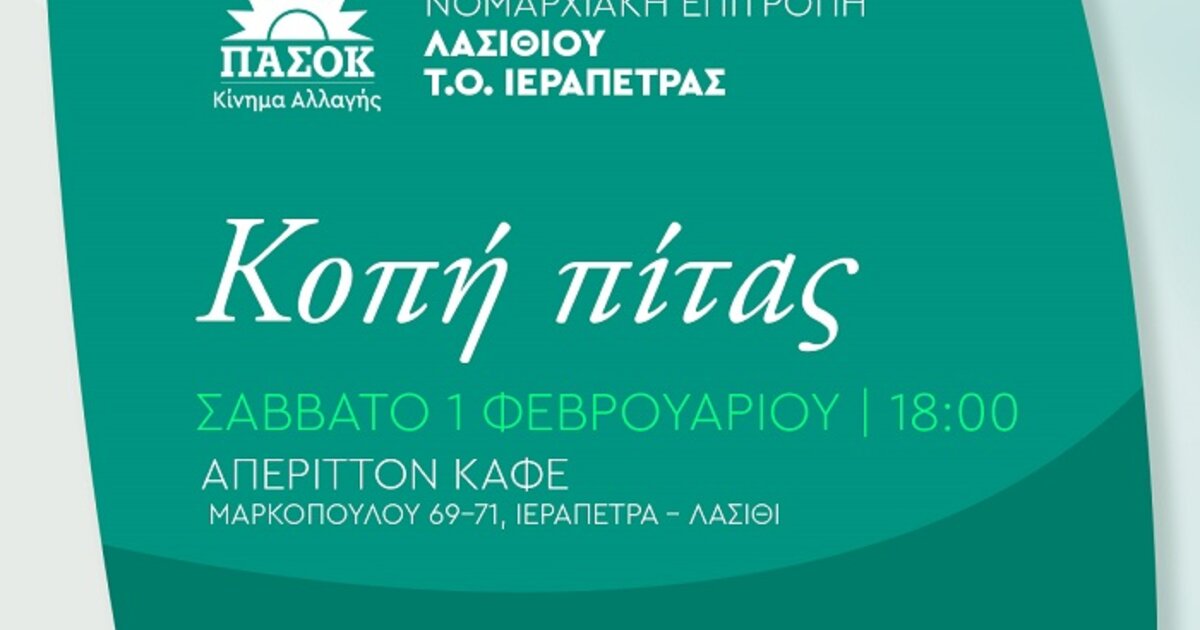 Η Νομαρχιακή Επιτροπή ΠΑΣΟΚ και η Τ.Ο. Ιεράπετρας διοργανώνουν την ετήσια εκδήλωση κοπής της βασιλόπιτας το Σάββατο 1 Φεβρουαρίου, στις 18:00 το απόγευμα.