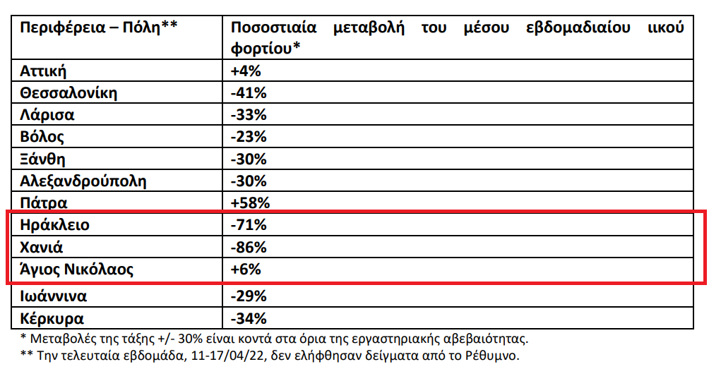 Ηράκλειο: Την τελευταία εβδομάδα, 11-17/04/22, στην πόλη του Ηρακλείου, η εβδομαδιαία μέση τιμή του ιικού φορτίου των αστικών λυμάτων συνέχισε να παρουσιάζει πτωτική τάση (-71%) σε σχέση με την προηγούμενη εβδομάδα, 04-10/04/22.