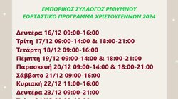Με ωράριο 09.00 - 18.00 θα λειτουργήσουν σήμερα τα καταστήματα και στο Ρέθυμνο. Στον Άγιο Νικόλαο τα μαγαζιά θα λειτουργήσουν επίσης ως τις 18.00 απόψε και θα ανοίξουν ξανά την Παρασκευή 03.01.2025 στις 09.00 το πρωί με ωράριο 09.00-14.00 και 17.00-21.00, ενώ το Σάββατο θα λειτουργήσουν με ωράριο 09.00-14.30.