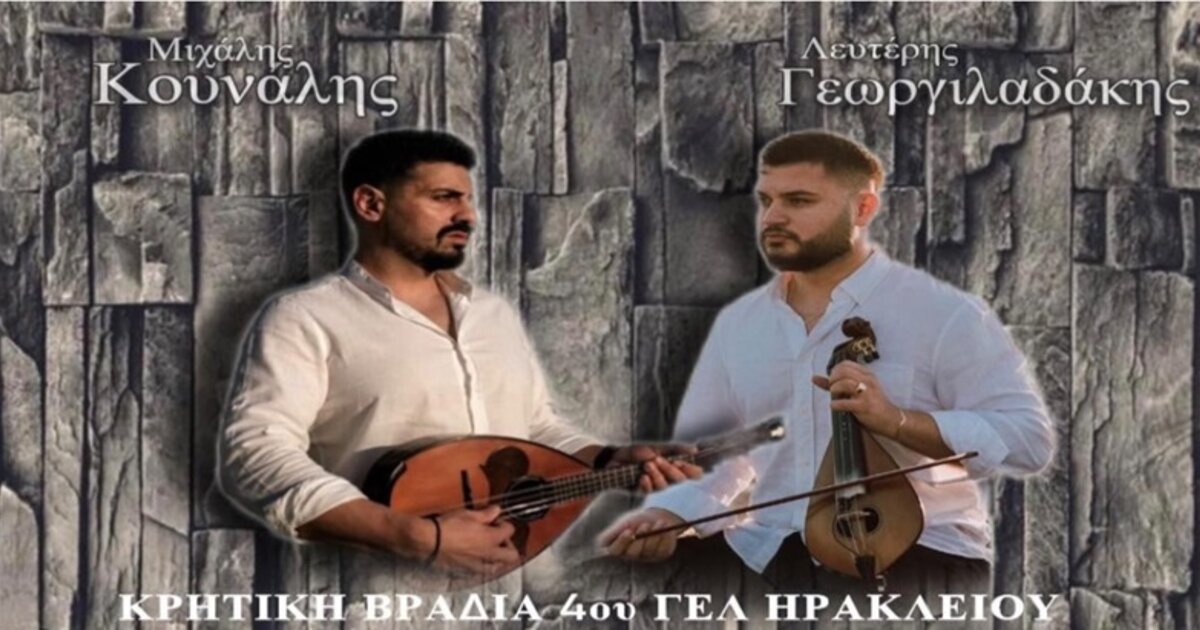 Το 4ο ΓΕΛ Ηρακλείου διοργανώνει κρητική βραδιά που διοργανώνει τη Δευτέρα 23 Δεκεμβρίου στο Κλειστό Γυμναστήριο του 4ου Γενικού Λυκείου (Φιλιππουπόλεως 45) με τον Μιχάλη Ι. Κουνάλη και τον Λευτέρη Γεωργιλαδάκη.