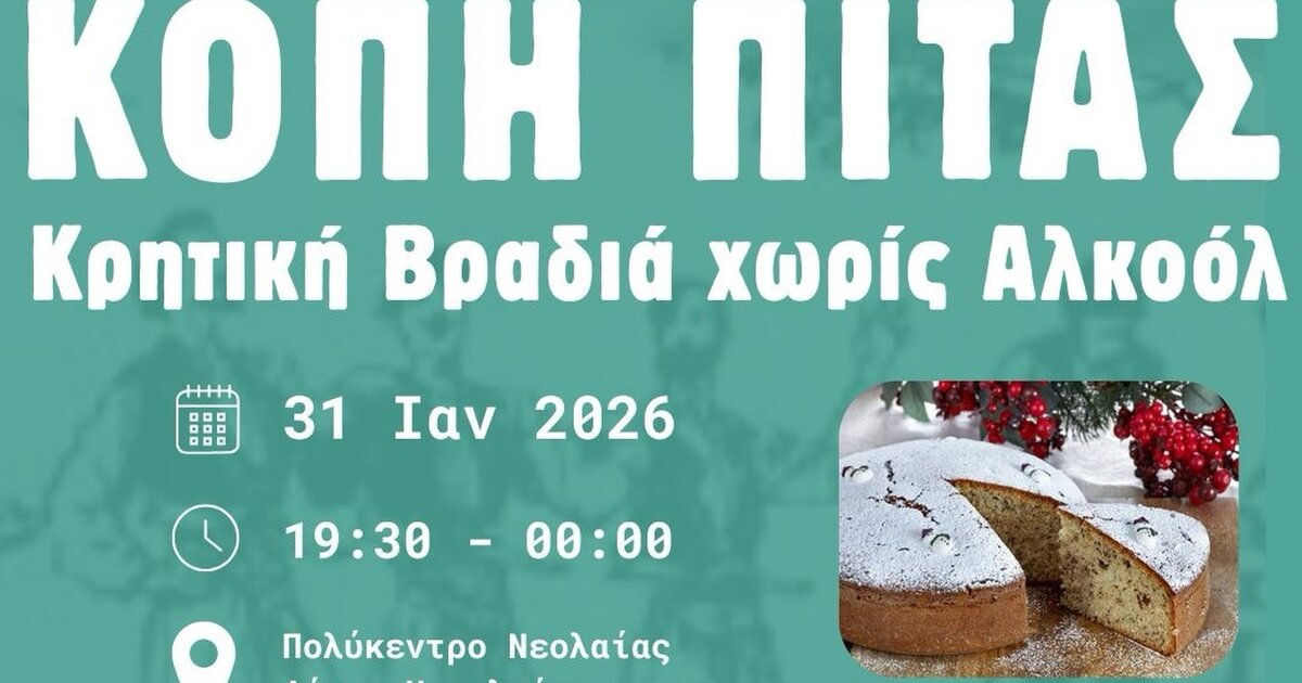 Η Παγκρήτια Συνέλευση Νέων της Περιφέρειας Κρήτης (Youth Crete) προσκαλεί στην κοπή της πρωτοχρονιάτικης πίτας της, το Σάββατο 31 Ιανουαρίου 2026, στο Πολύκεντρο Νεολαίας του Δήμου Ηρακλείου, με ώρα έναρξης 19:30.