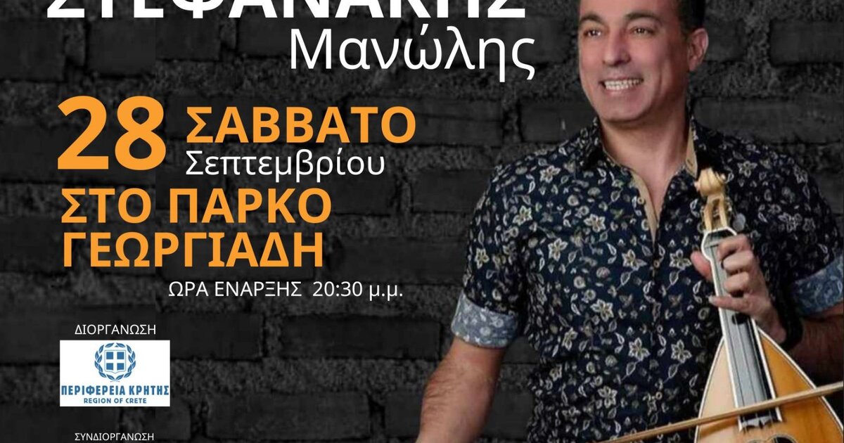 Το Σάββατο 28 Σεπτεμβρίου ο πολιτιστικός Σύλλογος Κνωσού, διοργανώνει Κρητική βραδιά με τον Μανώλη Στεφανάκη στο Πάρκο Γεωργιάδη στο Ηράκλειο.