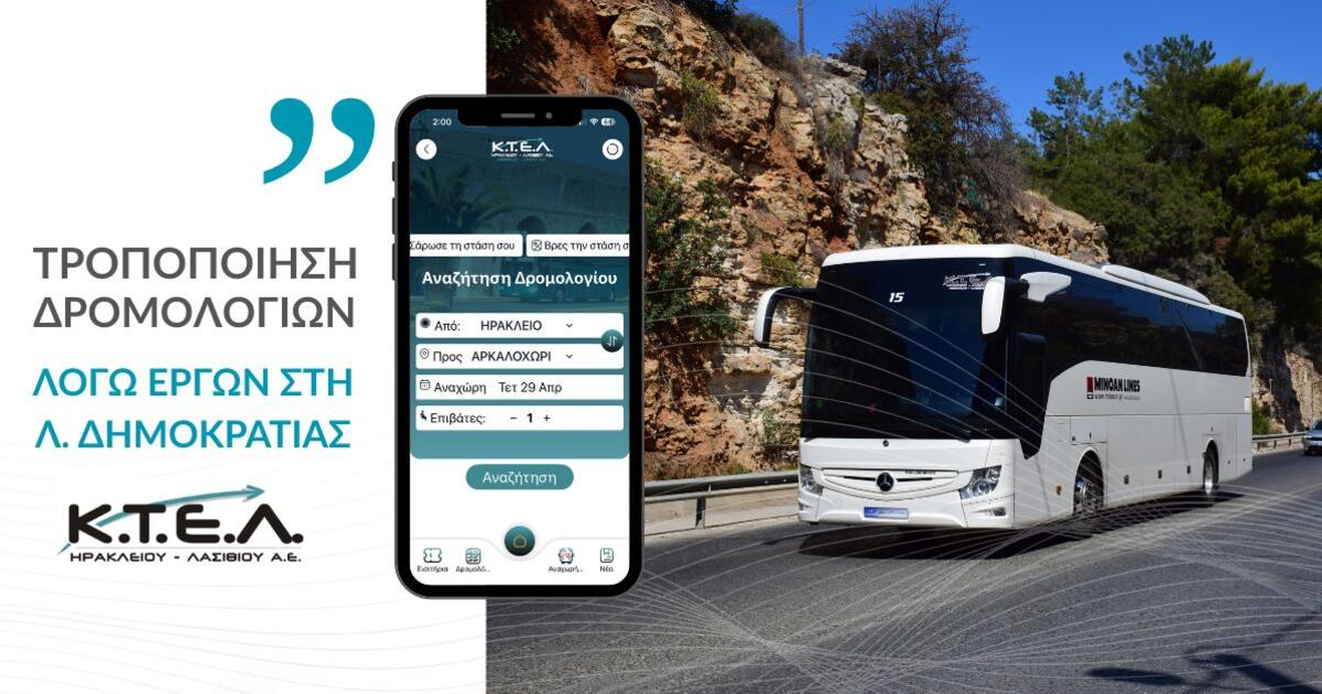 Η ΚΤΕΛ Ηρακλείου Λασιθίου ενημερώνει το επιβατικό κοινό ότι, λόγω εκτέλεσης έργων, η Λεωφόρος Δημοκρατίας (ρεύμα ανόδου) θα παραμείνει κλειστή από 29 Απριλίου και μέχρι νεοτέρας.