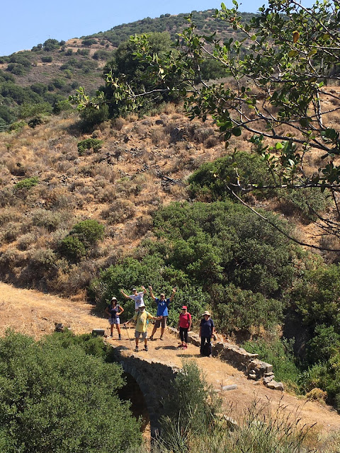 Σύντομη στάση για ένα αναψυκτικό στο mini market της κυρίας Κατίνας, που τα έχει όλα, όπως όλα τα μαγαζάκια των χωριών. Θαυμάζουμε την ποικιλία των λουλουδιών στις γλάστρες της, που στολίζουν τις δυο πλευρές του επαρχιακού δρόμου προς το Μόχλος, τον οποίο ακολουθούμε κι εμείς για λίγο, για να συνεχίσουμε από αγροτικό χωματόδρομο, που ελίσσεται μέσα από ελαιώνες, αρκετοί απ’ τους οποίους ….ανήκουν στην οικογένειά μου. «Και πως τους μαζεύετε, βρε Μαρία;» η εύλογη απορία, όταν βλέπουν την κλίση του εδάφους. «Ε με υπομονή», απαντώ γελώντας, ενώ χάνομαι για μια ακόμα φορά στην θέα στο ανοικτό πέλαγος, που σε ανταμείβει τώρα, όπως και το χειμώνα με τις ελιές! Σιγά-σιγά με τις κουβέντες κατηφορίζουμε και βρίσκουμε ξανά τη ρεματιά απ’ την οποία ξεκινήσαμε.