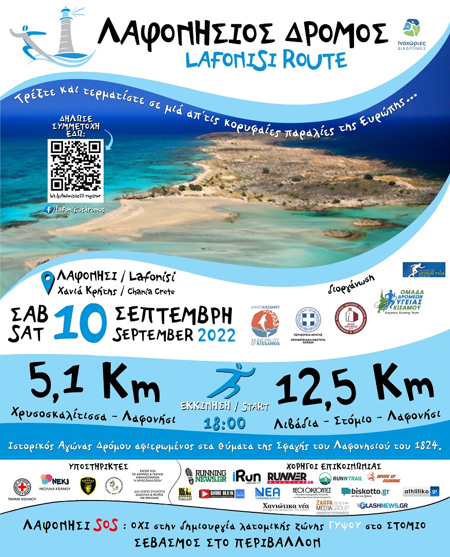Ο Δήμος Κισάμου , η Περιφερειακή Ενότητα Χανίων ,ο Μορφωτικός Πολιτιστικός Αθλητικός Σύλλογος Πλοκαμιανών Κισάμου, η Ομάδα Δρομέων Υγείας Κισάμου και ο Σύλλογος Δρομέων Υγείας Χανίων, διοργανώνουν για άλλη μια χρονιά τον Ιστορικό αγώνα τρεξίματος με την ονομασία «Λαφονήσιος Δρόμος» αφιερωμένος στα θύματα της Σφαγής του Λαφονησιού.