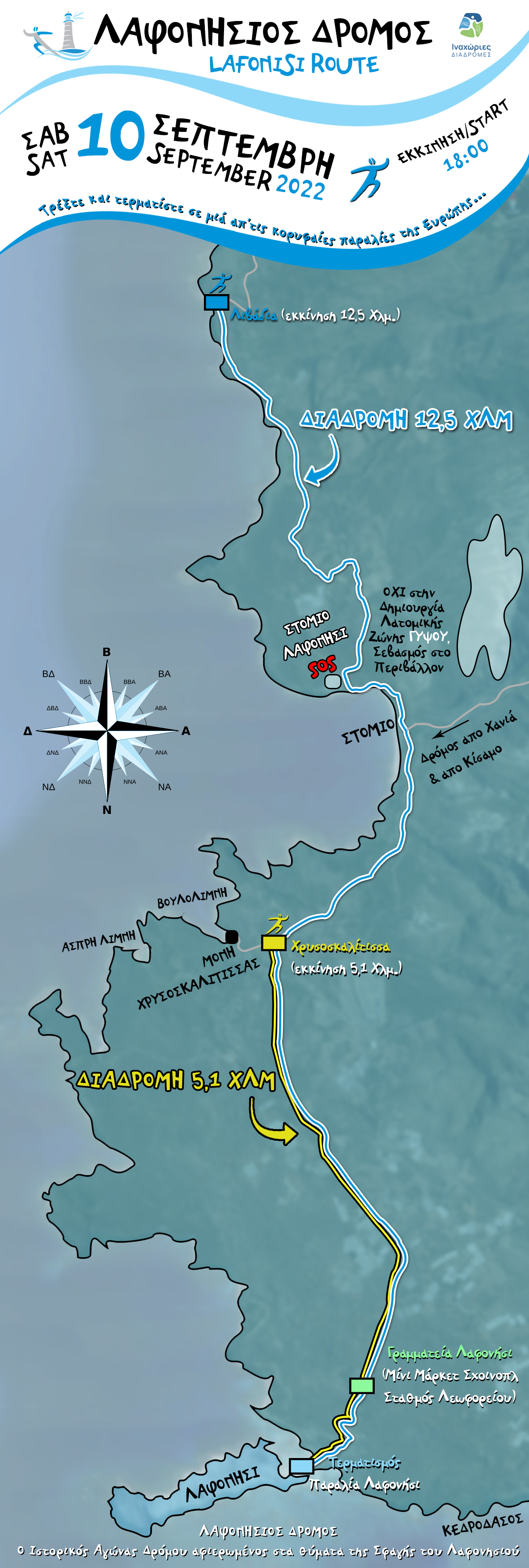 ΣΗΜΕΙΟ ΣΥΝΑΝΤΗΣΗΣ – ΓΡΑΜΜΑΤΕΙΑΣ: Λαφονήσι – Μίνι Μάρκετ Σχοινοπλοκάκης, 700 μέτρα πριν την παραλία https://bit.ly/lafonisios-grammateia (Θα υπάρχει μετακίνηση των αθλητών με λεωφορείο από εκεί προς στα σημεία εκκίνησης)